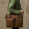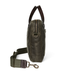 Our Tin Cloth Compact Briefcase is padded to protect a laptop or tablet up to 15. The front stow pocket extends the full width of the briefcase for carrying files. and the rear pocket snaps closed to secure contents. The main compartment’s heavy-gauge metal YKK zipper is built for a lifetime of service. The fabric is our signature Tin Cloth. a tightly woven duck canvas that’s been thoroughly saturated with liquefied wax under heat and pressure for maximum water resistance. Tin Cloth’s tight weave provides outstanding resistance to abrasion and punctures without excessive weight. The Bridle Leather handles are thick and strong for lasting service.. The interior is fully lined with cotton Cover Cloth. Detachable. adjustable webbing shoulder strap.