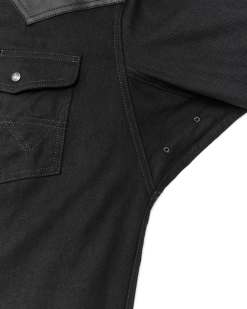 A durable special-edition shirt made from 7.3-oz. denim with a right-hand twist. Denim’s legendary dependability and comfort on ranches. jobsites. and Naval ships has made it a favorite fabric for work and daily wear. The shoulders are made from a washable waxed canvas that adds durability and a bit of water resistance if caught in a shower without a jacket. The back yoke is vented for breathability. and the front is pointed for Western flair. Antiqued bronze snaps secure the front. pocket flaps and cuffs. Forearms are reinforced with the same washable waxed canvas as the yoke. Wrangler’s signature ‘W’ is embroidered on the front pockets.