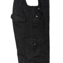 Filson wool bibs have kept outdoorsmen warm in freezing conditions for three decades. The thick 24-oz. wool is made from longest. strongest fleece fibers. The thick yarns are tightly woven into a dense twill fabric that sheds water and wind while remaining highly breathable. Our wool wicks moisture away for evaporation and insulates dry or wet. Mackinaw’s tight weave also provides outstanding durability. often being handed down to the next generation. The relaxed fit of our bibs provides unrestricted ease of motion for active use. The sides are gusseted sides with metal buttons for easy on/off. Flapped cargo pockets on the chest and legs keep essentials close at hand. Elastic suspenders. Unhemmed.