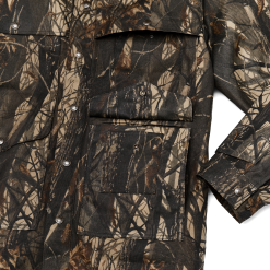 Our oil finish Tin Cloth is a tightly woven canvas duck that’s been thoroughly saturated with paraffin under high pressure and heat. This process forces the wax into the core of the cotton fibers for lasting water resistance. This Cruiser fuses Tin Cloth’s legendary durability and weather resistance with the original Realtree® Hardwoods™ camouflage pattern that we first used 25 years ago.