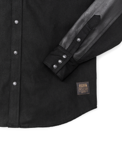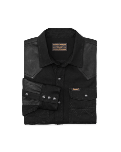 A durable special-edition shirt made from 7.3-oz. denim with a right-hand twist. Denim’s legendary dependability and comfort on ranches. jobsites. and Naval ships has made it a favorite fabric for work and daily wear. The shoulders are made from a washable waxed canvas that adds durability and a bit of water resistance if caught in a shower without a jacket. The back yoke is vented for breathability. and the front is pointed for Western flair. Antiqued bronze snaps secure the front. pocket flaps and cuffs. Forearms are reinforced with the same washable waxed canvas as the yoke. Wrangler’s signature ‘W’ is embroidered on the front pockets.